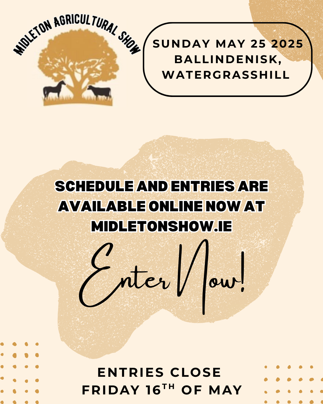 There is only one week left to enter this year's show! Make sure to get your entries in here on the website before Friday 16th of May. See you in Ballindenisk on Sunday 25th.
