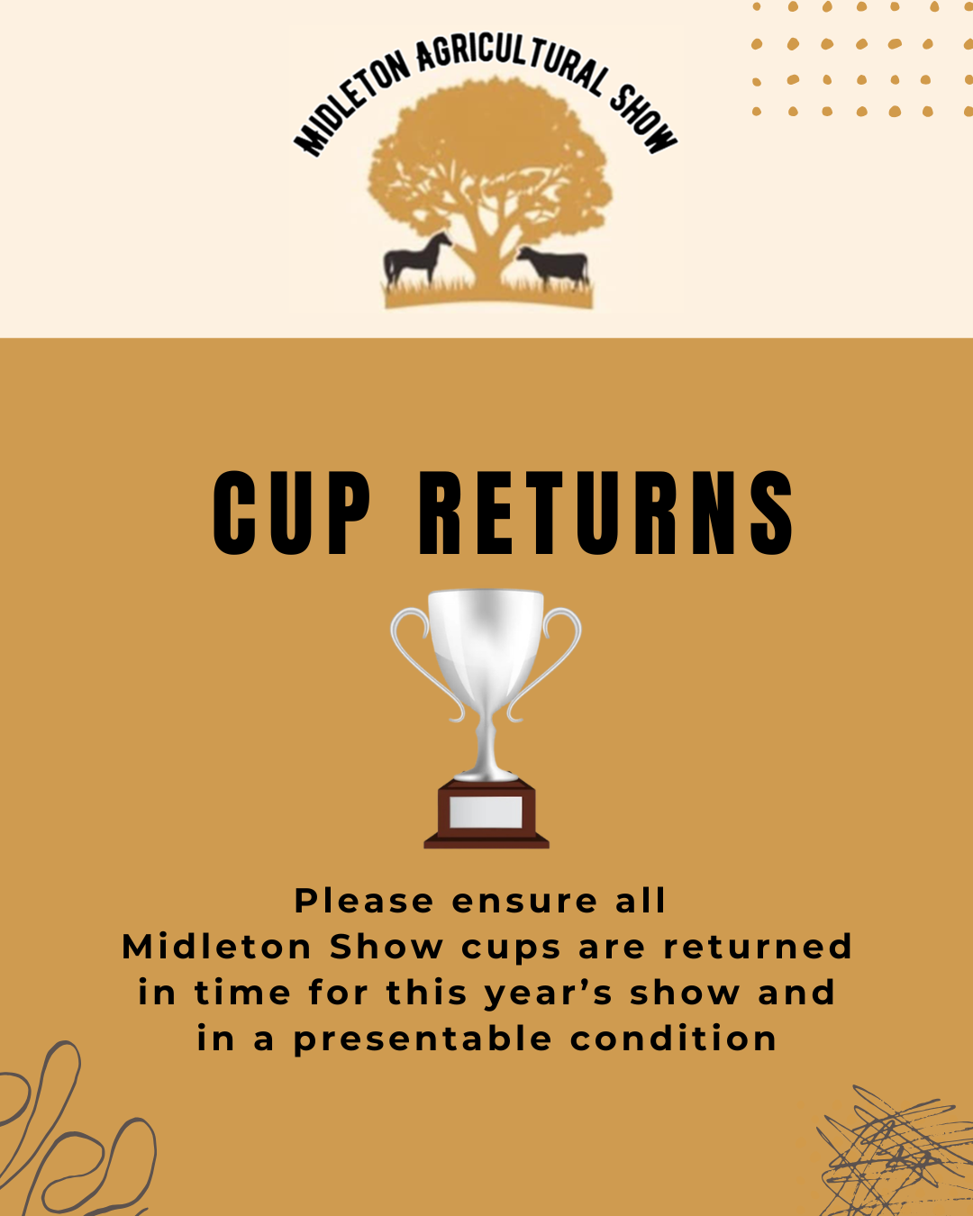 Please kindly get in touch to arrange the safe return of our Prepetual Cups won at last year's show so they are ready for the upcoming 2026 show!