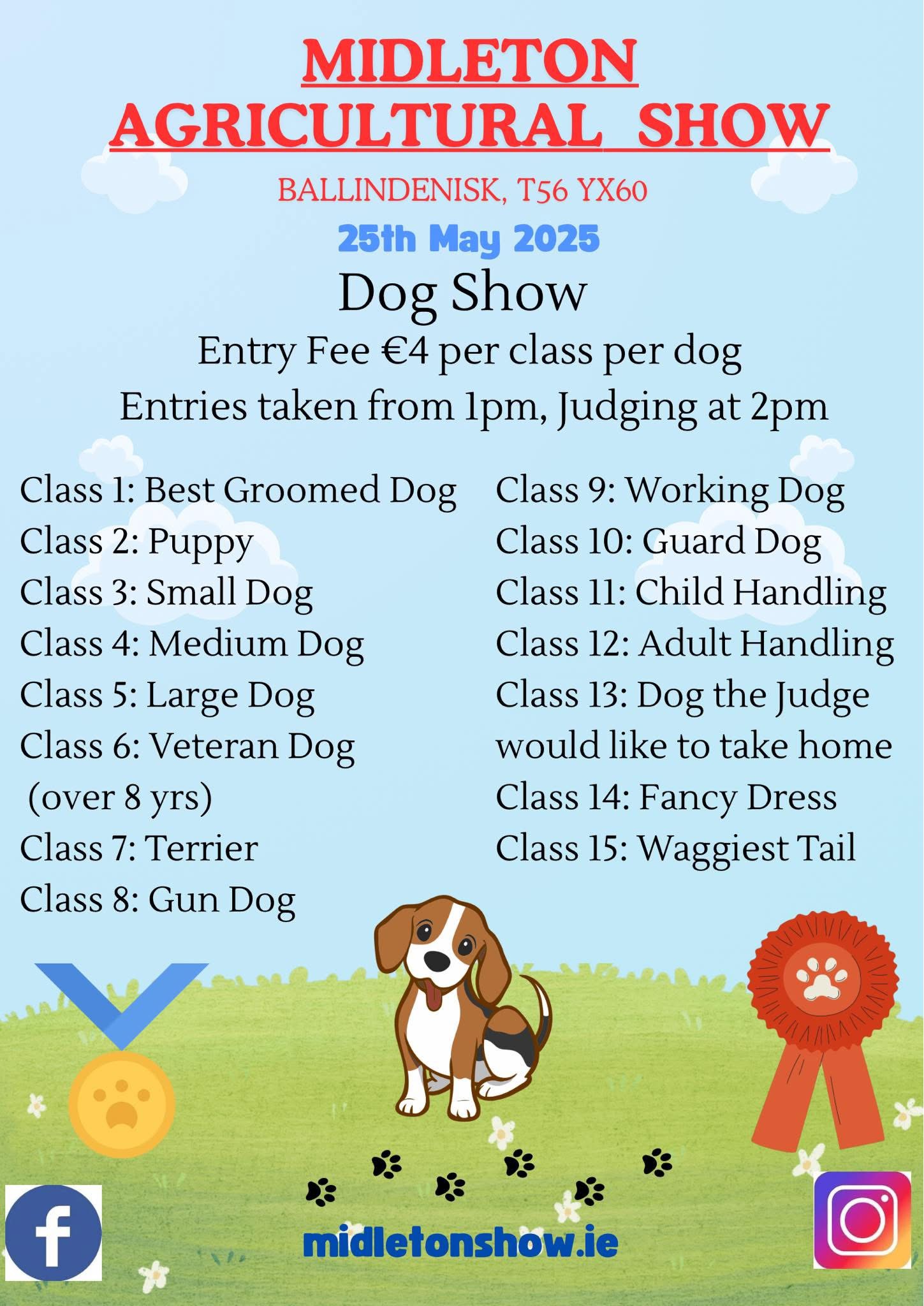Don't forget about our fun dog show on show day. There is a wide range of classes and entries are taken on the day from 1pm with the dog show commencing at 2pm. Entries are €4 per dog per class.