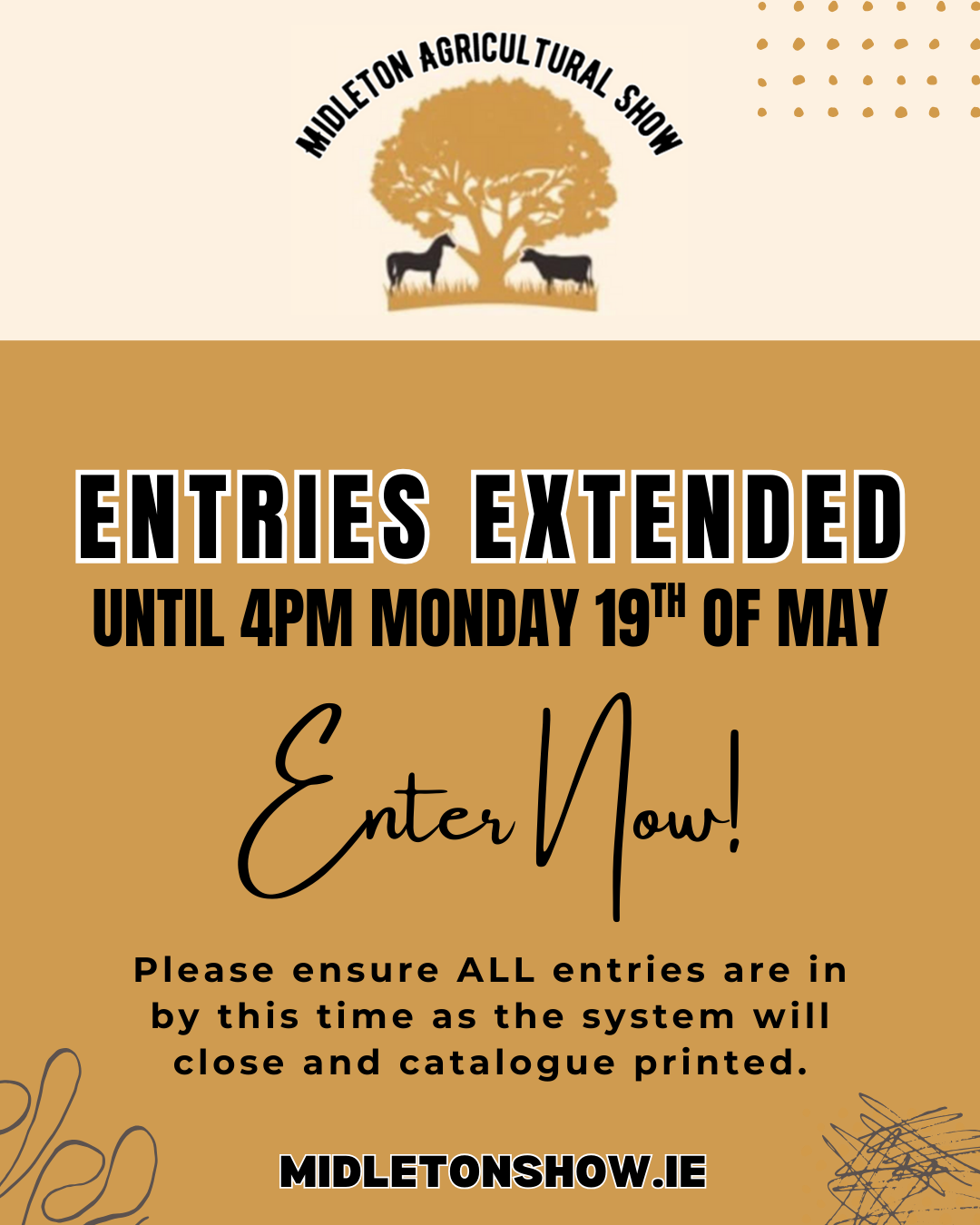 The closing date foe entries has been extended so make sure you get your entries in by 4pm on Monday 19th of May and we will see you in Ballindenisk on the 25th!!!