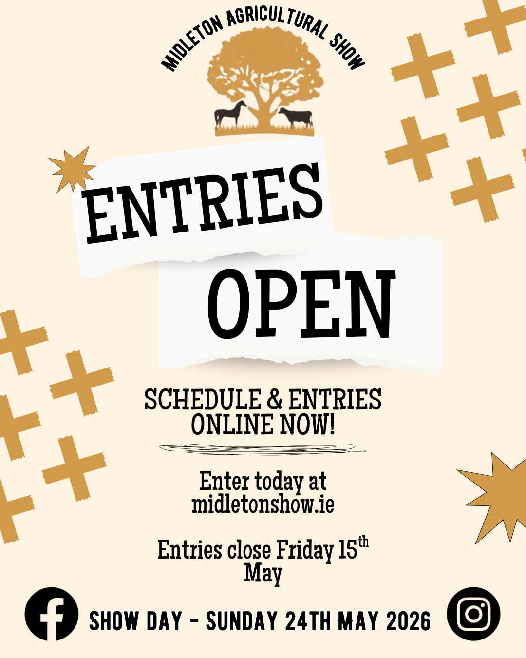 Enter now in one of the broad range of classes available at this year's show which will be held on Sunday 24th of May in Ballindenisk, Watergrasshill, Co. Cork. Browse through the document below or view our classes in the 'View Classes' section of the 'Competitions' tab. Enter here online on our website, midletonshow.ie before entries close on Friday 15th of May. We look forward to seeing you all in Ballindenisk on the 24th of May!